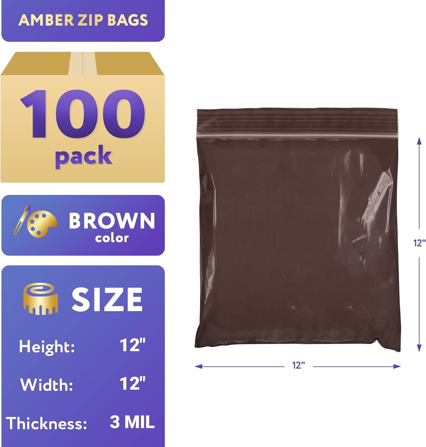 Amber Zip Bags 12x12 Inch Size. Pack of 100 Brown Plastic Zip Bags. Resealable Plastic Bags for Electronics & Light-Sensitive Products. 3 Mil Thick Recloseable Sample Bags 12" x 12" Plastic Zip Bag