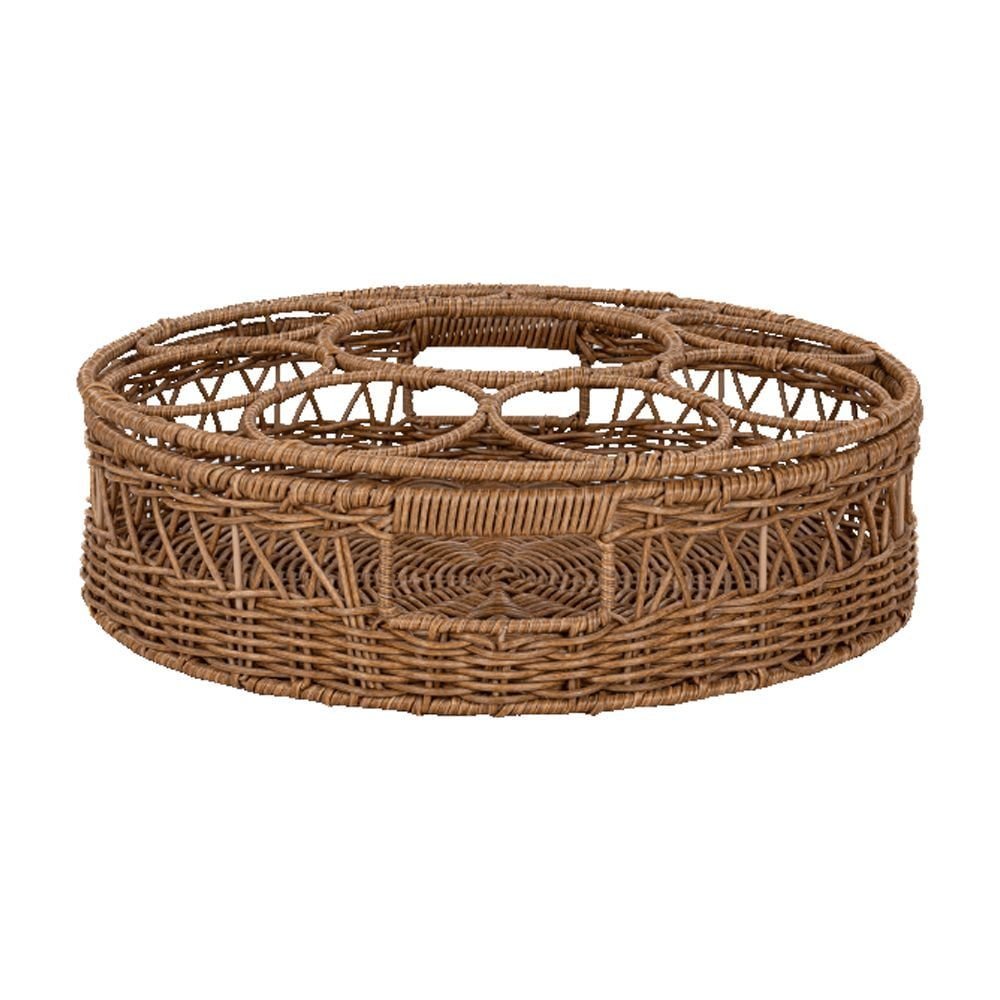 Product detailsThe Better Homes & Gardens Rattan Beverage Tray is a practical and stylish option for any gathering. It has a strong steel frame and is lightweight, so it is easy to transport. The woven resin rattan and rich brown finish give it an elegant look that fits any setting. This tray is great for carrying different beverages and glasses, making it easy to host. For a complete entertaining experience, consider pairing it with items from the Better Homes & Gardens Serveware Collection!Handy circle-shaped beverage caddy with 9 compartmentsDivided compartments to keep your drinkware secure while carryingIdeal for use in the kitchen, on the porch, or by the poolHandwoven twisted resin rattan over a durable metal frameBrown finish adds natural beauty to your tableCan be used to carry more beverages and glassesCasual style is ideal for entertaining and family get-togethersMakes a wonderful wedding or housewarming giftWipes clean with a damp clothFor indoor and outdoor useProduct materials: Resin rattan, metalProduct dimensions: 15.55 IN L x 15.55 IN W x 4.92 IN H