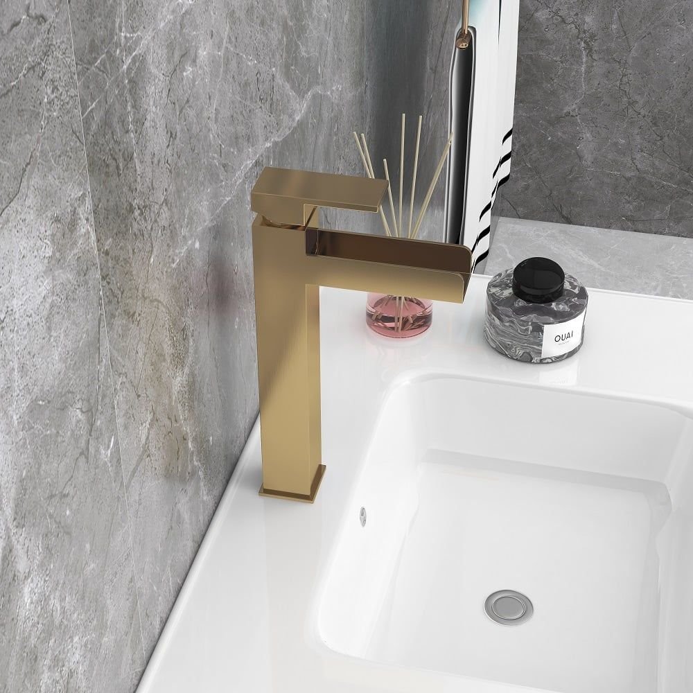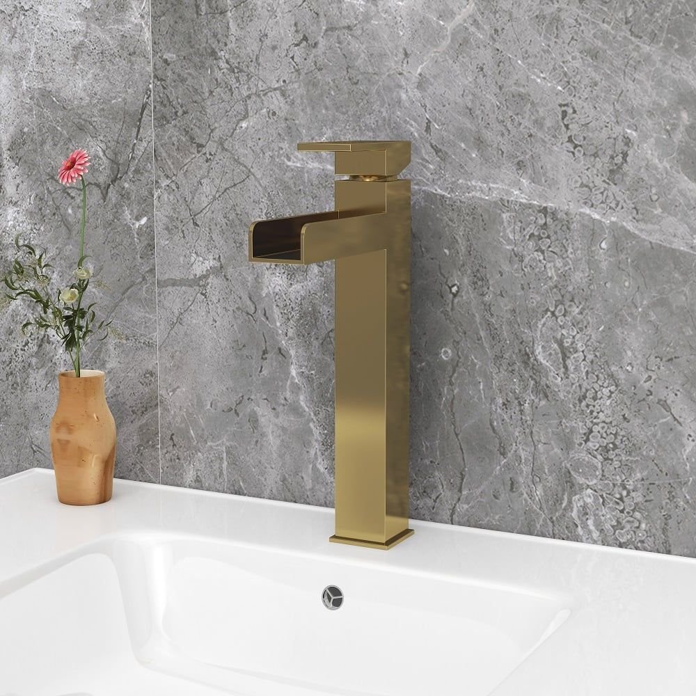 Modernize your bathroom with this contemporary waterfall vessel sink faucet. Squared corners and crisp, straight lines create this bathroom faucet with a simple, clean look, perfect for today's bathroom upgrade. With a long trough spout, it creates a mini attention-grabbing waterfall that makes any washing or cleaning a fun. And a flat handle offers precise no-splash water flow and temperature control. Constructed from solid brass and coated with premium finish, this faucet ensures a safe, reliable use for years to come and enhances the modern styling.