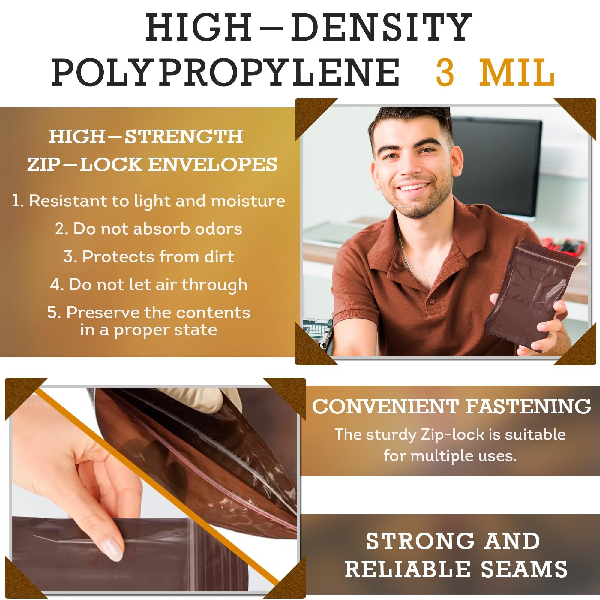 Amber Zip Bags for Packaging, 4 x 6 inch. Pack of 100 Plastic Zip Baggies 3 Mil Thick. Water Resistant Reclosable Plastic Bags with Zipper Closure for Travel, Storage, Packaging and Shipping