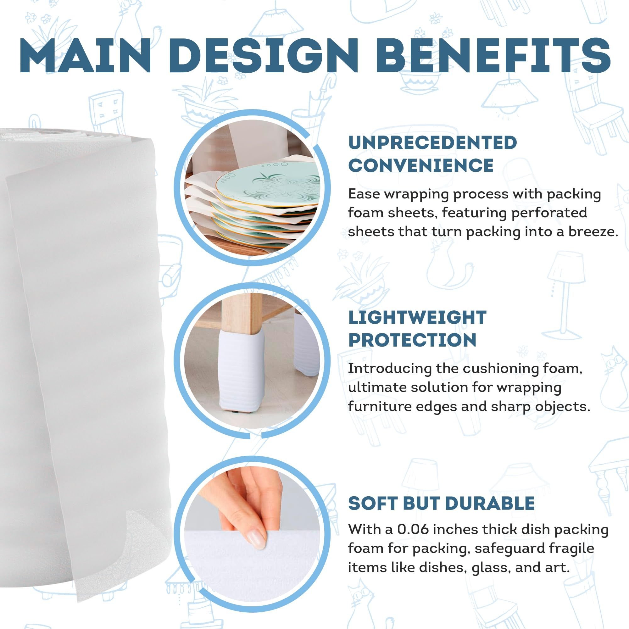 1.1 Roll of White Foam Sheets for Moving 12 inch x 60 feet. With a 0.06 inches thick dish packing foam for packing, safeguard fragile items like dishes, glass, and art. Strong, sturdy, and soft, foam packing roll comes in 6 rolls, each with 12 x 12 inches perforated sheets, 360 sheets in total.